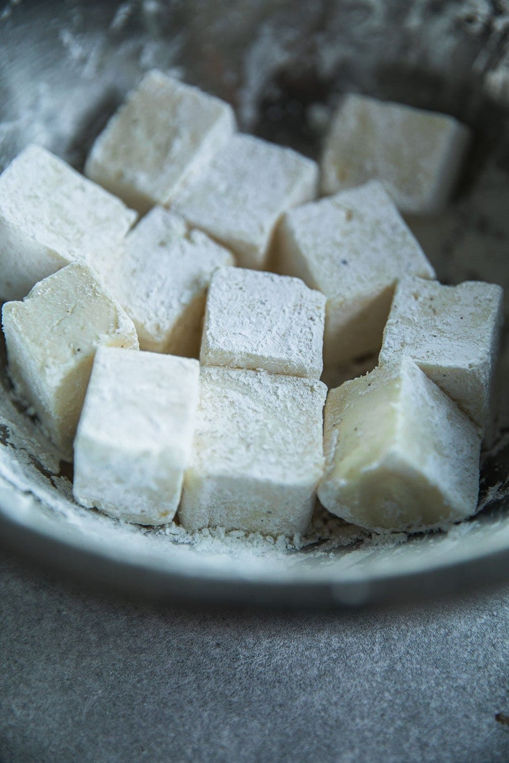 To prepare the paneer, add paneer cubes, cornflour, salt and pepper in a medium bowl. Toss to coat the paneer evenly with the cornflour.