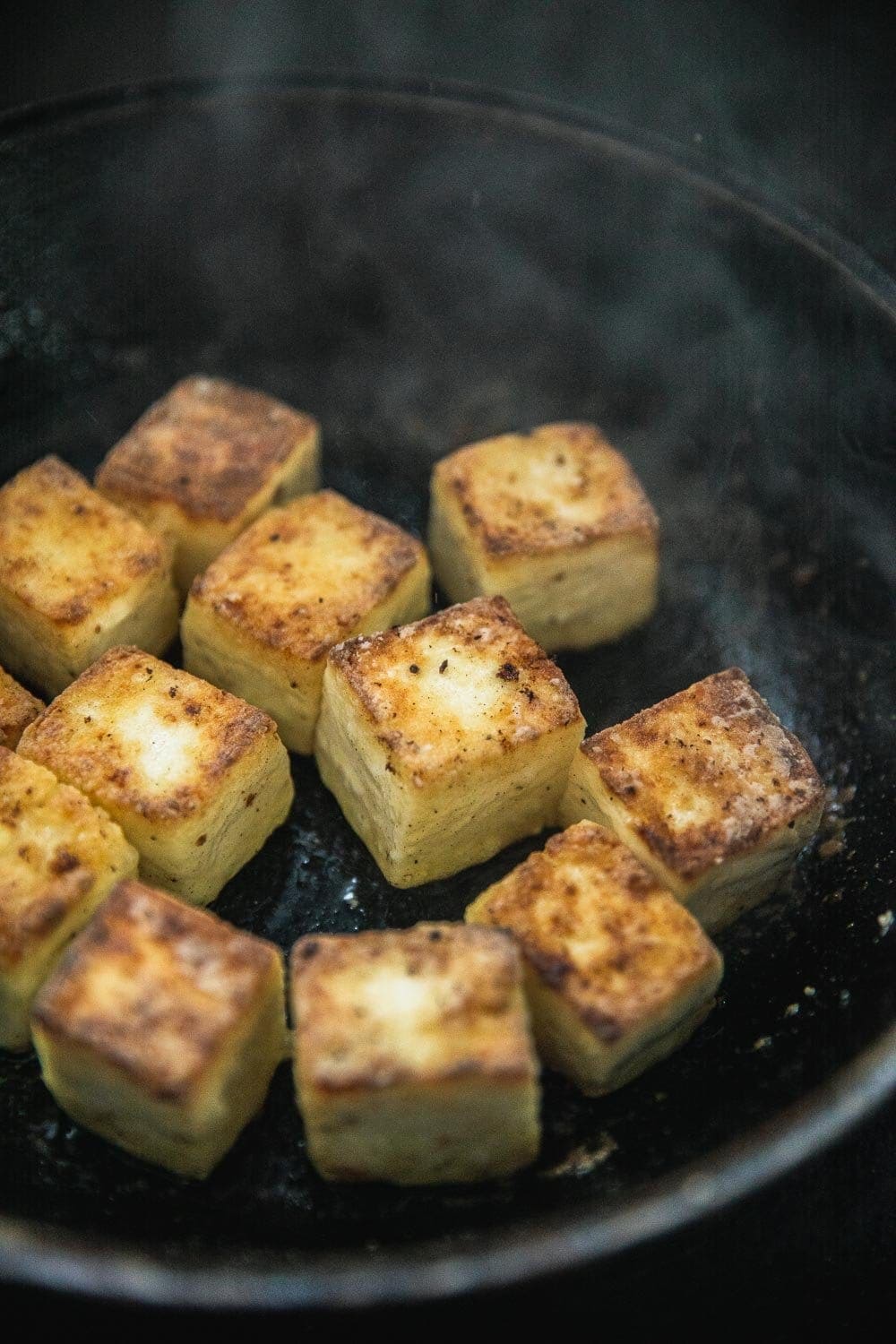 Heat a tablespoon of oil in a frying pan on medium. Add the coated paneer cubes to the pan and fry until each side is golden brown and crispy, turning constantly with a butter knife.