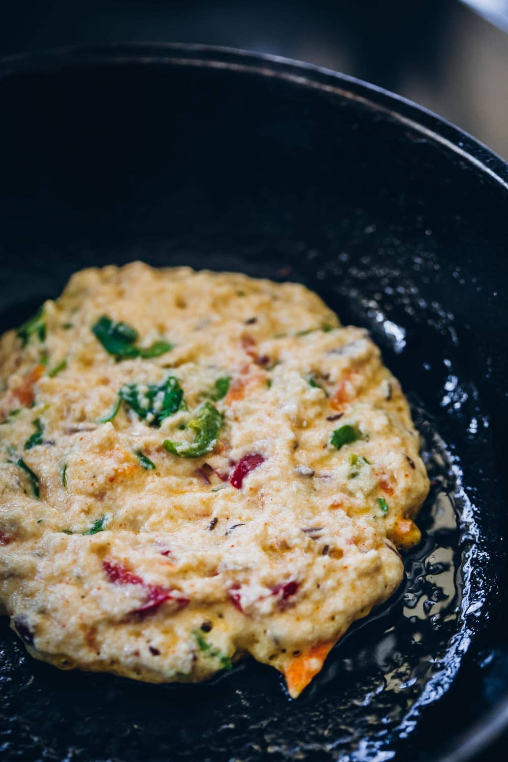 The vegetables are lightly cooked in oil for a few minutes before being added to the batter. This is a very clever technique to ensure that the vegetables aren’t crunchy and raw in the final dish and that they don’t sweat while cooking in the pancake batter. Cooking the vegetables first, removes their excess water and dries them a but so when they cook with the batter, they don’t release liquid and keep the pancake dry and fluffy.