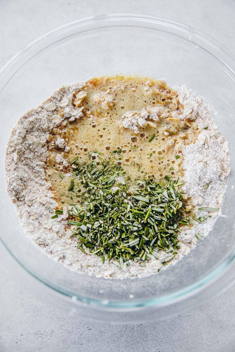 Add plain flour, rolled oats, desiccated coconut, rapadura sugar, salt and rosemary leaves to a large bowl. Mix well.