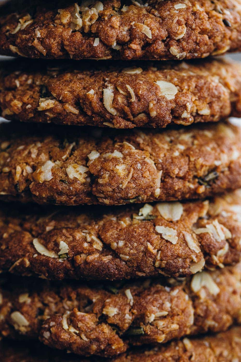 I first starting adding chopped rosemary to my Anzac Biscuits after coming across a recipe on an Australian Blog called Erin Made This many moons ago. The blog no longer exists but you can still see Erin’s beautiful bakes on her Instagram profile. After her blog became defunct, I was forced to modify my own Anzac Biscuit recipe to create the crispiest, most golden biscuit studded with bright, freshly chopped rosemary leaves. An abundance of them!