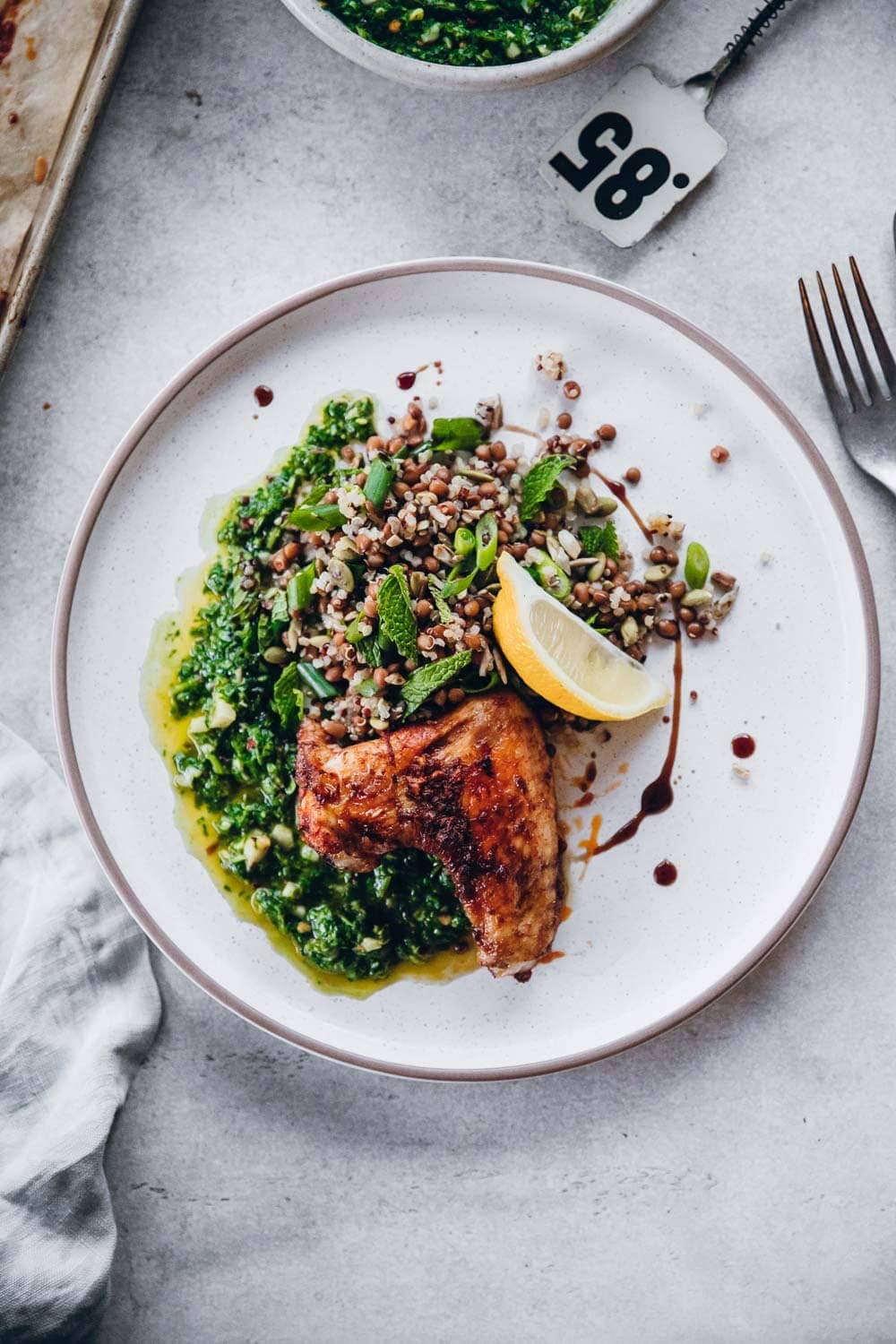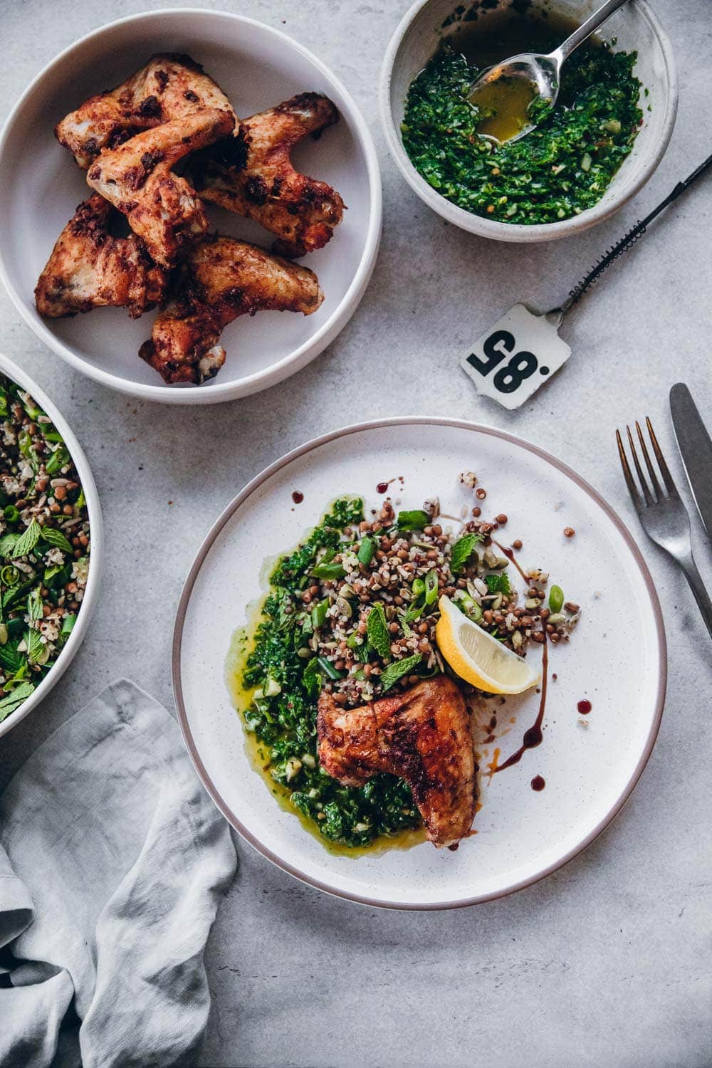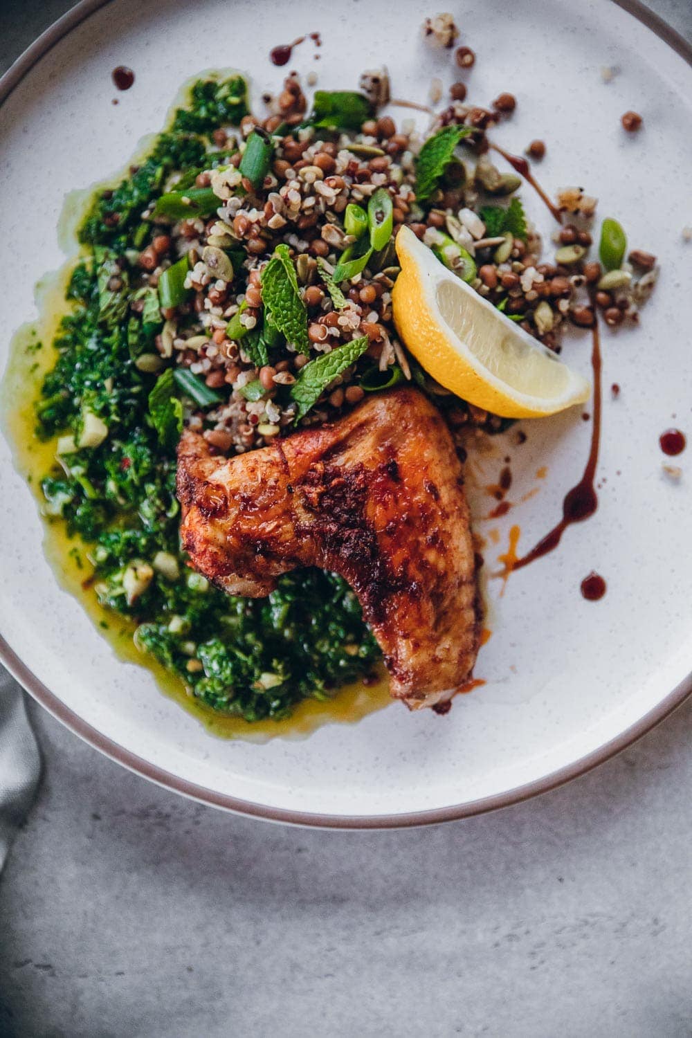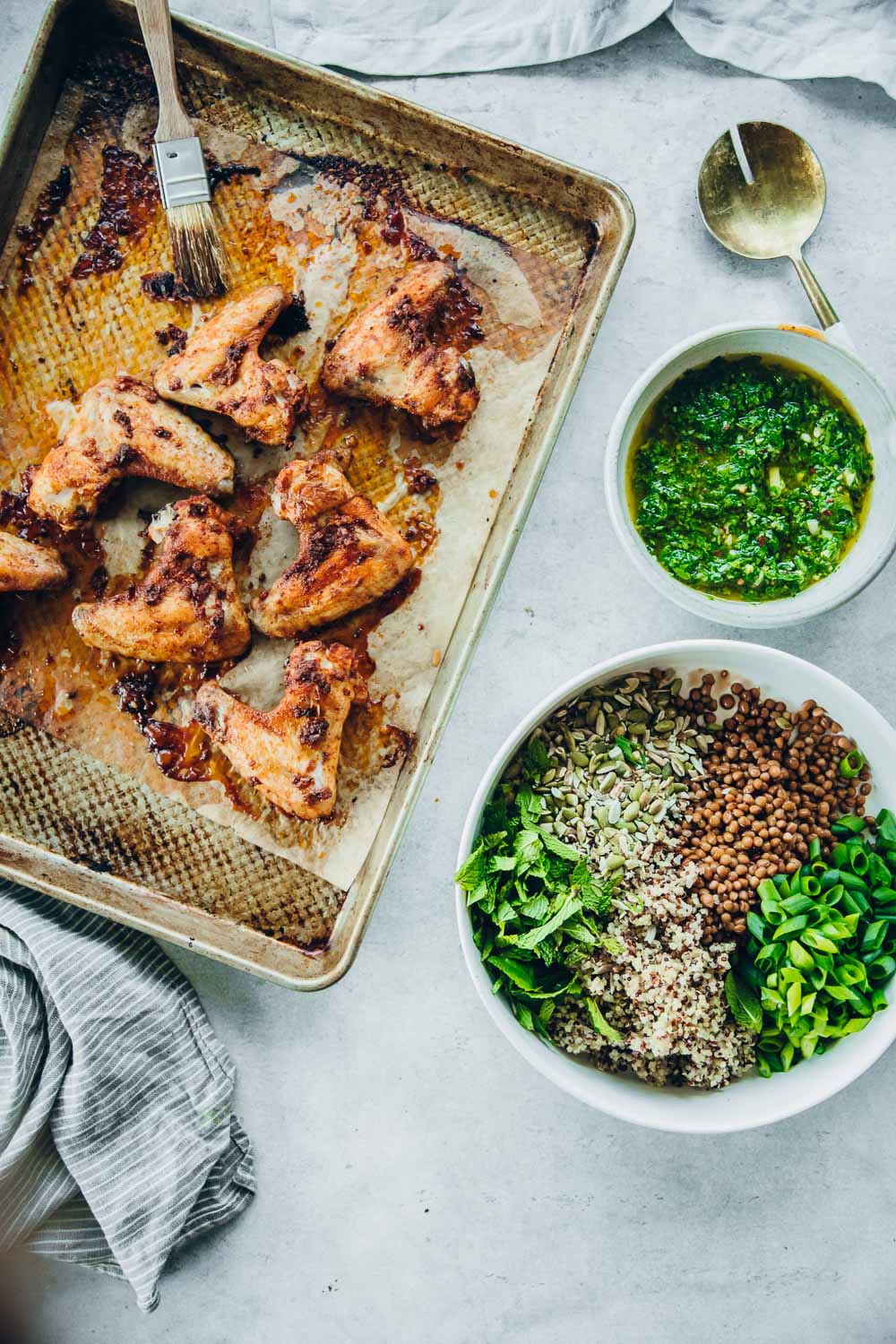 A solid sauce is a great foundation for a dish that requires hardly any cooking. The stalwarts of this Spring dinner are my vibrant green Chimichurri sauce and the smoky garlic and paprika marinade. My boys love chicken wings and I have dozens of recipes with gorgeous marinades that I cook for them. But most of them are standalone chicken wing recipes that they eat as a snack. This one is special because it is a complete meal that comes together with smaller meal prep recipes – like cooked quinoa, chimichurri sauce, lentil salad.