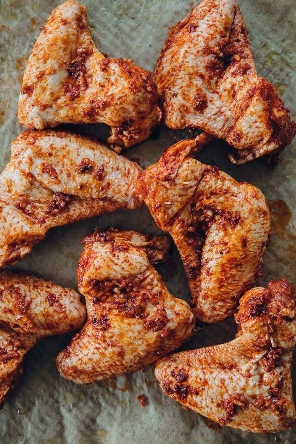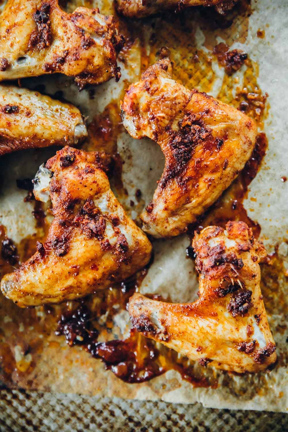 When roasting in the oven, I never roast on foil. The protein invariably ends up sticking to it. I always use baking paper when the protein is going directly onto the paper (fish, chicken, tofu etc..). Because chicken wings don’t release a lot of liquid as they roast, they are okay to go on a baking paper. But roasting them on a baking rack gives a crisper result. To do this, I lightly oil a baking rack and pop the chicken wings onto it so there is plenty of airflow above and below the chicken for optimum crispness. This also allows the excess sauce and fats to drip away and not pool around the chicken making it soggy. Before serving, I use a pastry brush to brush the cooked wings with the excess sauce that drains away.