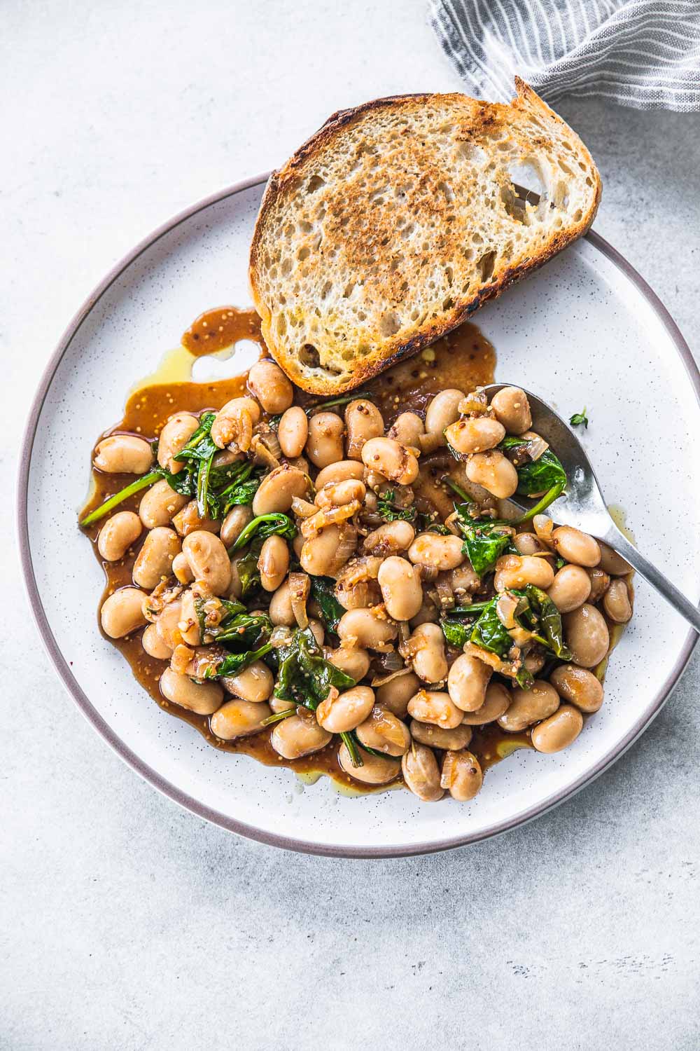 Creamy butter beans cooked with caramelized onion and garlic and a hint of smokiness make the best topping for a good sourdough and freshly cut avocado. These Spinach Garlic Butter Beans are not only easy to make but are just like the ones you might find at a good city cafe.