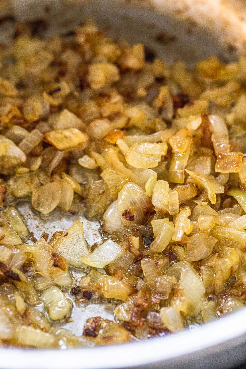 Perfectly cooked, golden caramelized and almost buttery onion forms the base of the recipe. Cooking onion correctly is not only about using the right amount of fat and heat but also the right pan. For this recipe, I use a heavy-bottomed stainless steel saute pan. These pans take a little longer to heat up completely but once they do, their heat retention is perfect.